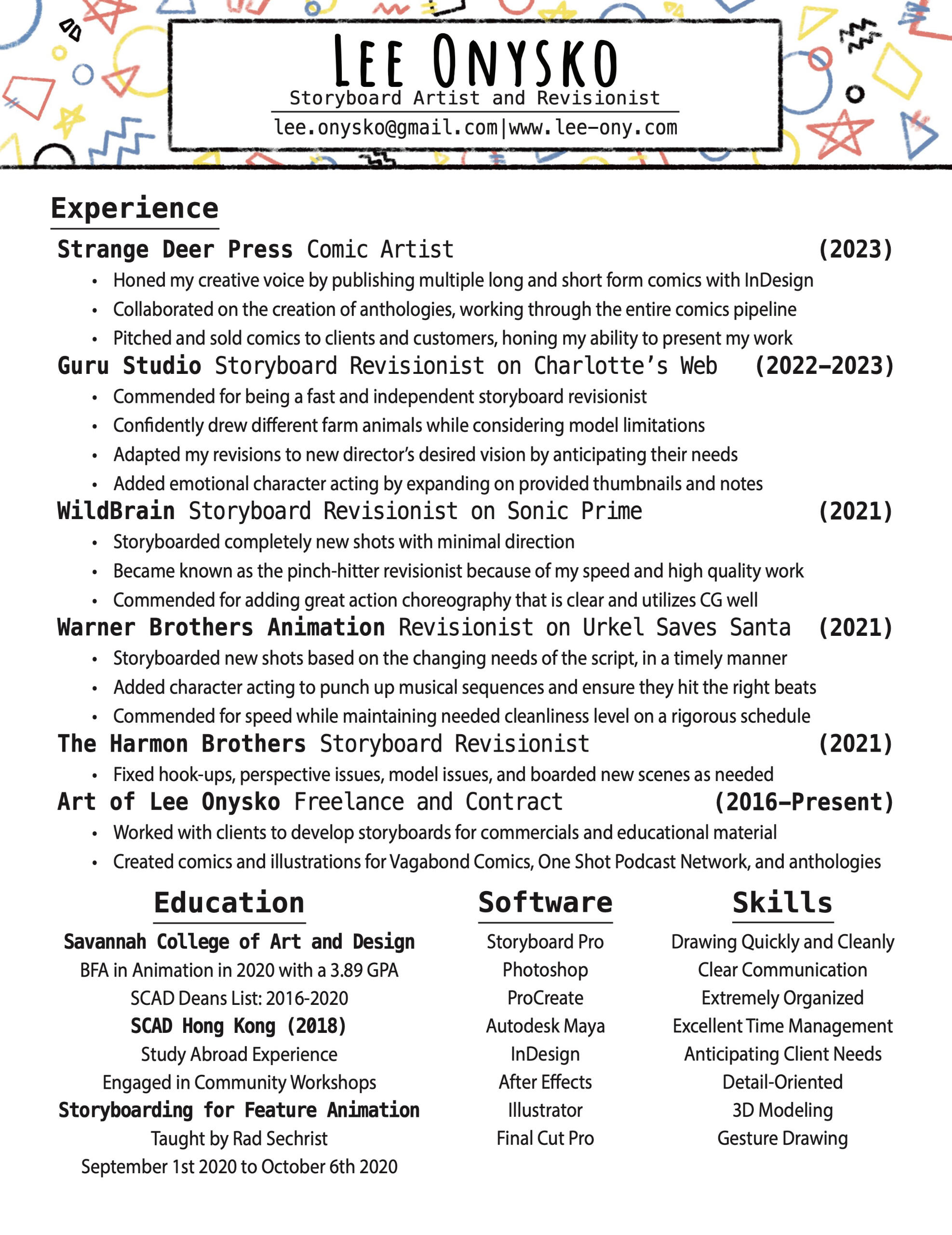 Lee Onysko is a storyboard and comic artist from Northeast Ohio. Multiple years in the animation industry has made them an experienced storyboard artist and revisionist, specializing in action, kids comedy, and drama. They also make heart-warming and funny comics that they like to sell at conventions along with the comic collective they're a part of, Strange Deer PressSelf proclaimed and friend endorsed robot lover, cat person, and space nerd, they love a good sci-fi/fantasy story but can always be tempted by the mundane and slice-of-life. When not drawing they can be found crocheting, working on custom dolls, or dreaming about building their own hydroponics system. While they work digitally for the most part, they are starting to branch out into working traditionally more with inks and colored pencils.